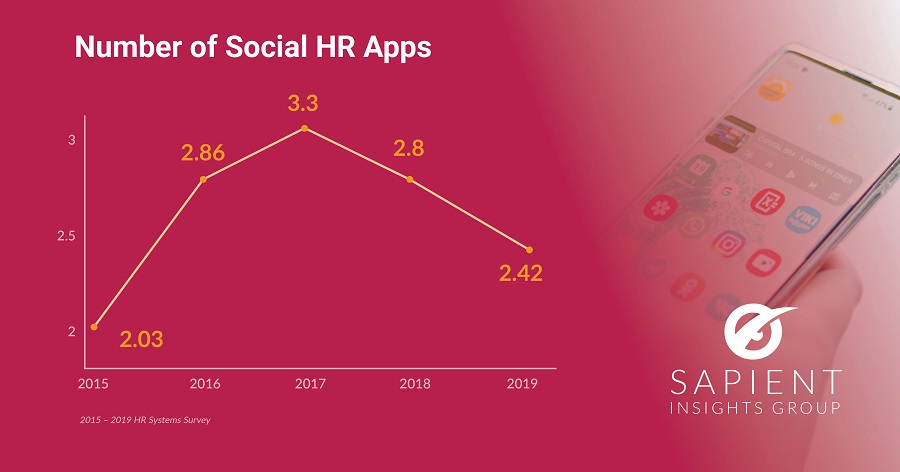 The number of Social Applications used strategically for HR peaked in 2017 and has since been trending back down. We believe this is a function of HR teams experimenting with different social applications throughout 2015 and 2016, eventually settling on a few that met their needs for communication, recruiting, or branding. There is a story here about the value of Social Applications for the HR function and it will be interesting to see if this increased in 2020 along with work-from-home strategies.