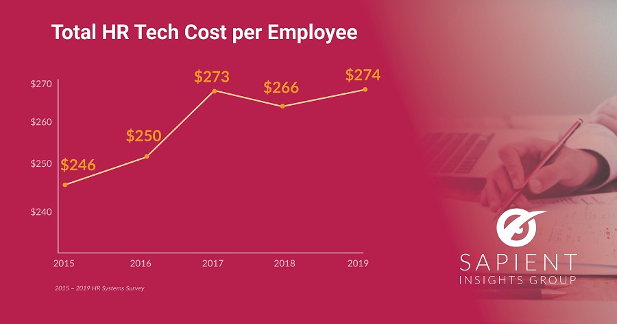 Between 2015 and 2019, the average number of “major” HR applications included in an organization’s “per Employee” annual HR Technology cost has steadily increased. We expect this number to continue to rise as organizations expand the universe of HR Technology applications to include wellness and safety applications, communication platforms, and productivity tools.
