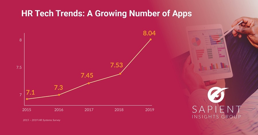 Between 2015 and 2019, the average number of “major” HR applications included in an organization’s “per Employee” annual HR Technology cost has steadily increased. We expect this number to continue to rise as organizations expand the universe of HR Technology applications to include wellness and safety applications, communication platforms, and productivity tools.