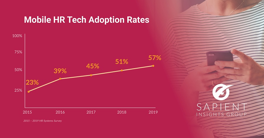 The use of Mobile technology is so pervasive that expectations for its use in the workplace are at an all-time high. Last year, Mobile-Enabled HR reached the tipping point and now it’s becoming table stakes with 57% of organizations deploying some level of Mobile HR applications. The #1 type of Mobile HR applications provided to employees are Time and Attendance, followed closely by HRMS.