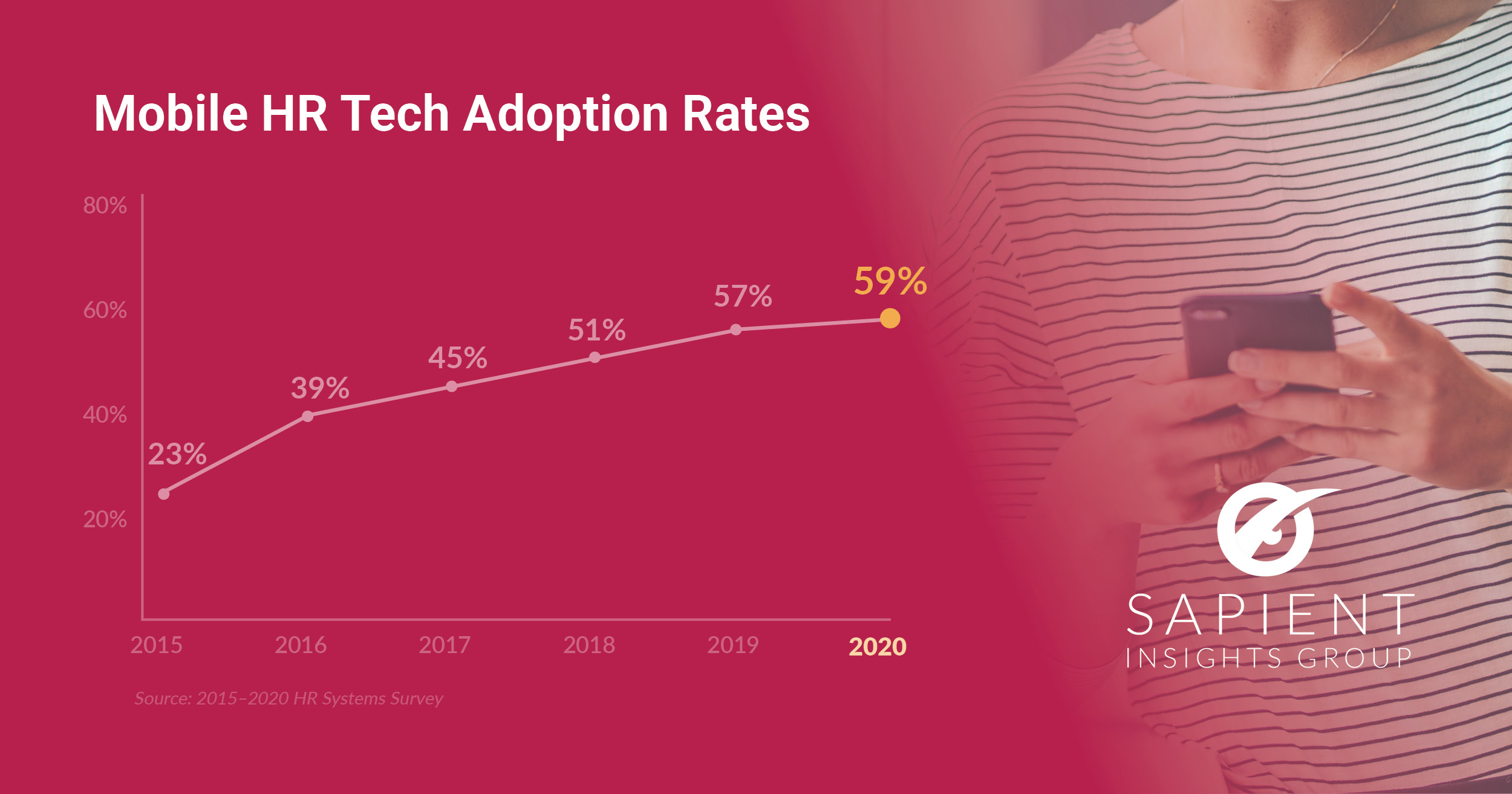 The use of Mobile technology is so pervasive that expectations for its use in the workplace are at an all-time high. Last year, Mobile-enabled HR reached the tipping point and now it’s becoming table stakes with 59% of organizations deploying some level of Mobile HR applications in 2020. The # 1 type of Mobile HR applications provided to employees are Time and Attendance, followed closely by HRMS.