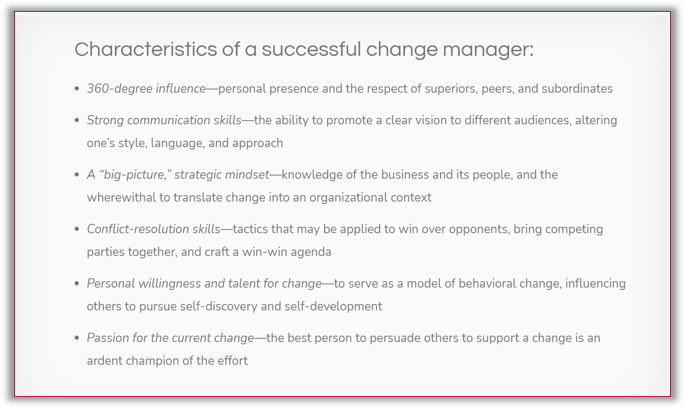 In a world where two out of three major change initiatives fail, one finding stands out: Organizations that consciously manage change, by activities like communicating, leading by example, and engaging employees, as much as double their chances for success. That is an astonishing statistic, and one that makes the role of change manager vital to business survival.